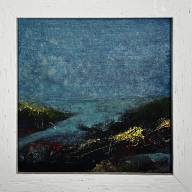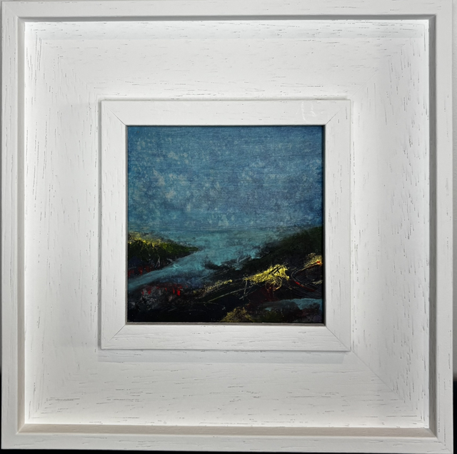 10 cm x 10 cm on wood panel with 21 cm x 21cm wood white frame.