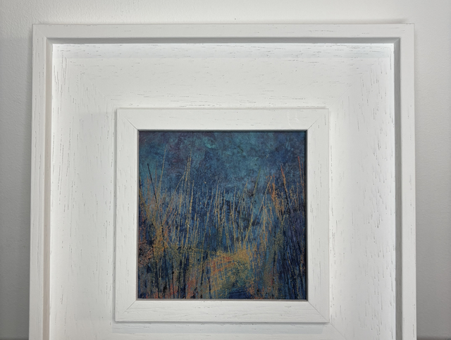 10 cm x 10 cm on wood panel with 21 cm x 21cm wood white frame.